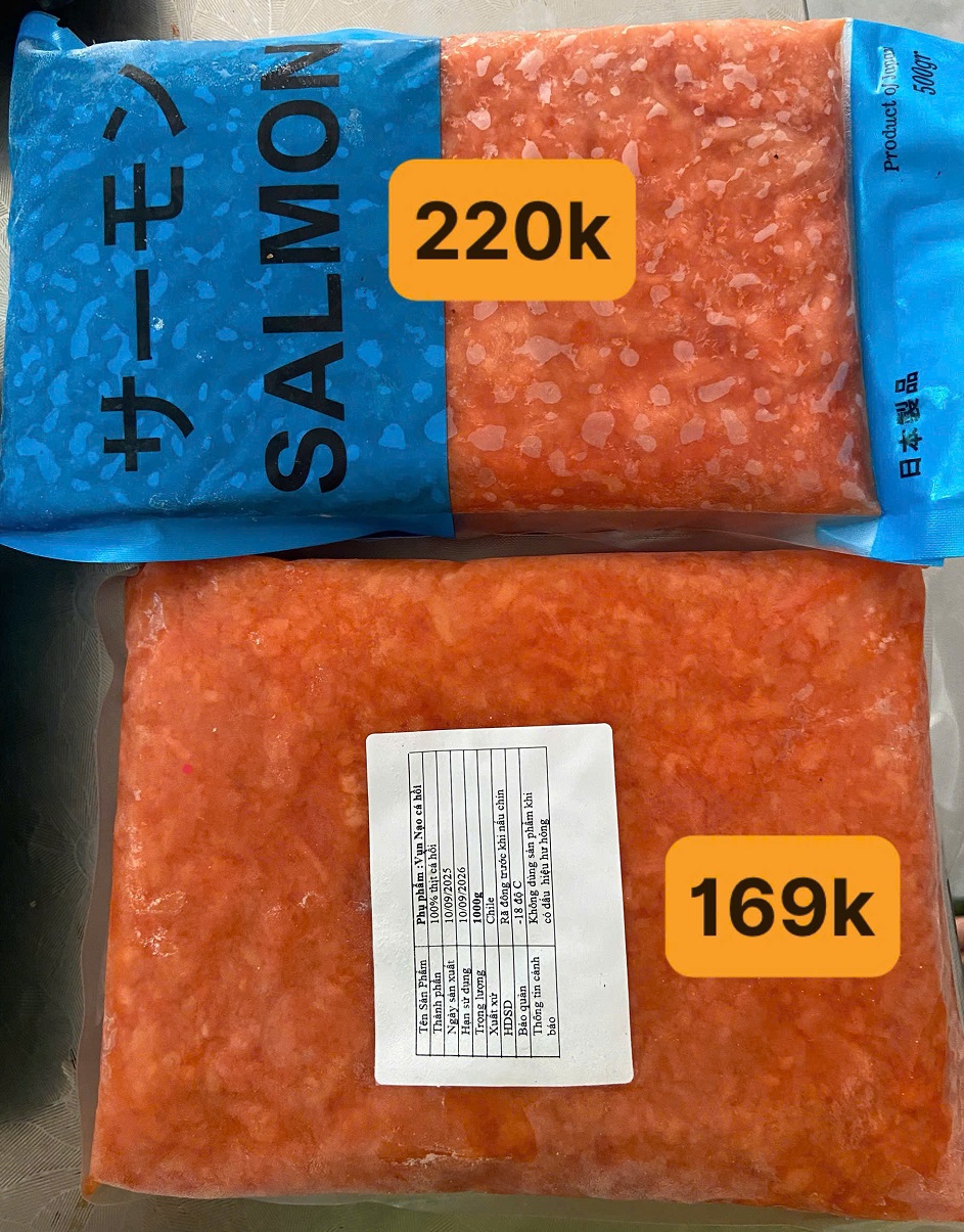 Ngoài ra Donfood còn có vụn cá hồi Nauy bao xanh giá 220.000 VNĐ/KG