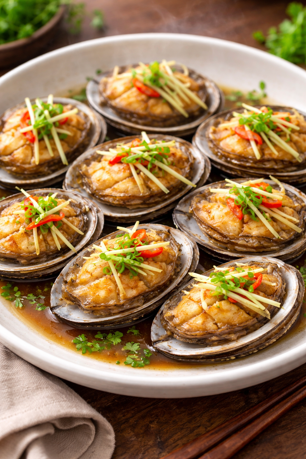 Sau khi hấp, bào ngư trở nên mềm giòn và thơm nhẹ mùi gừng, rất phù hợp cho bữa tiệc gia đình.