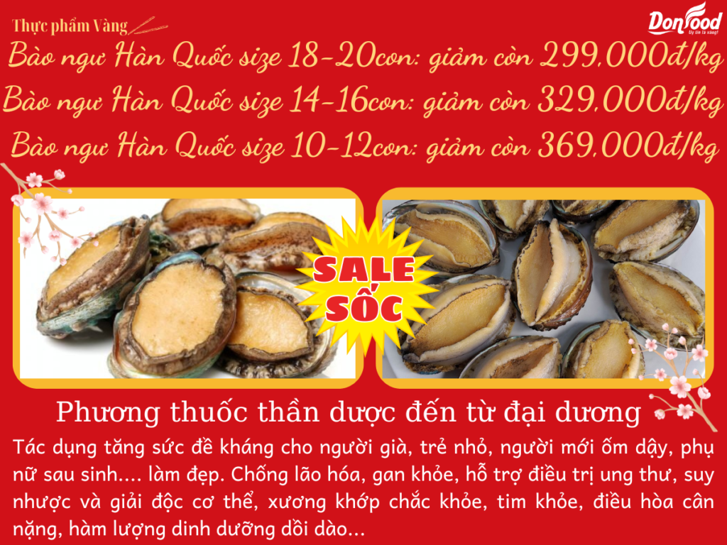 | Mâm cúng Giao Thừa | Bào Ngư Hàn Quốc size 10–12 | Vừa sang trọng vừa mang ý nghĩa truyền thống – dễ chế biến |
