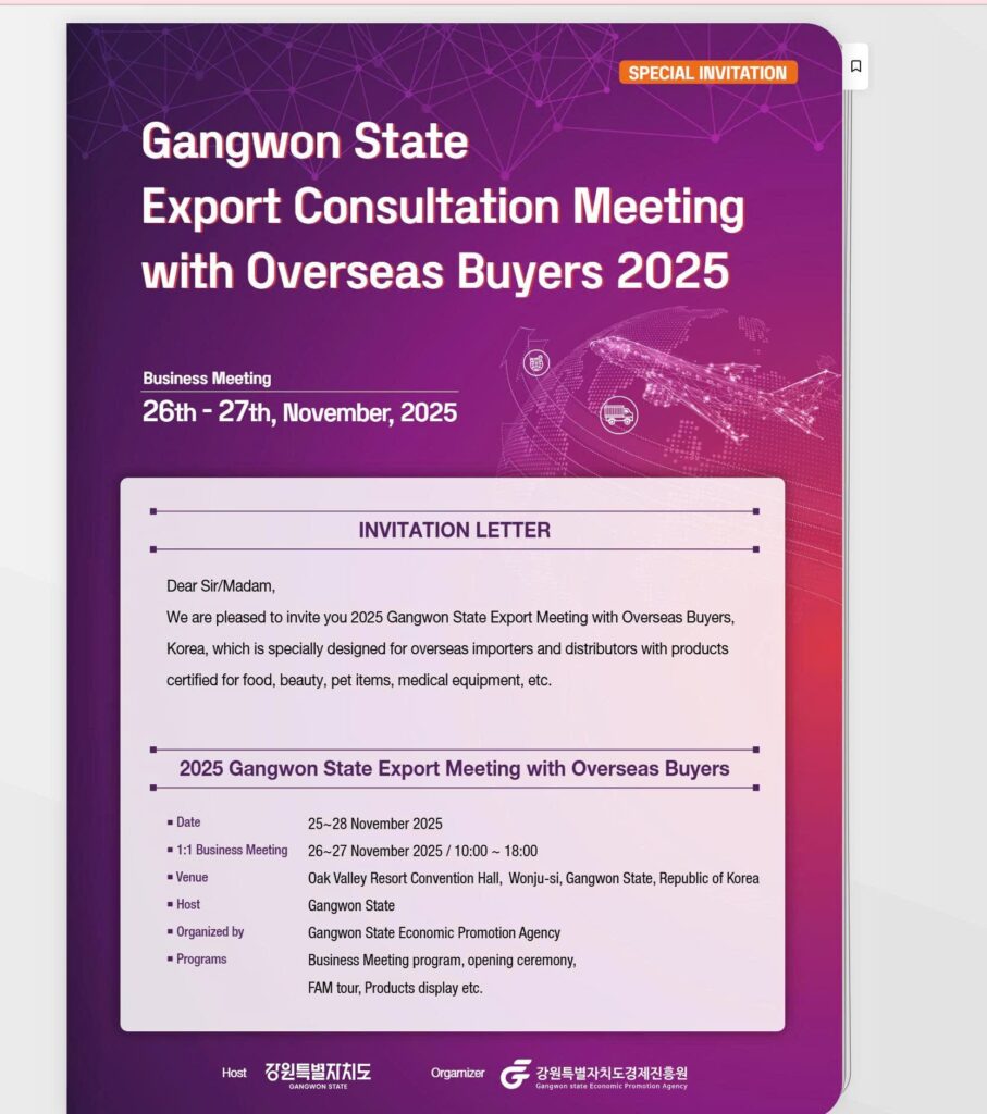 Sự kiện diễn ra tại Thung lũng Sồi Wonju, tỉnh Gangwon – nơi được xem là trung tâm xúc tiến thương mại quốc tế của khu vực Đông Bắc Hàn Quốc, quy tụ hơn 100 doanh nghiệp sản xuất thực phẩm – hải sản – gia vị truyền thống tiêu biểu nhất của tỉnh.