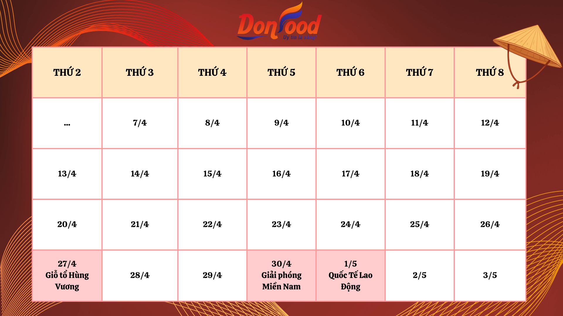 DonFood chúc bạn và gia đình một kỳ nghỉ 30/4 – 1/5 thật thư thái, trọn vẹn và ngập tràn cảm hứng.